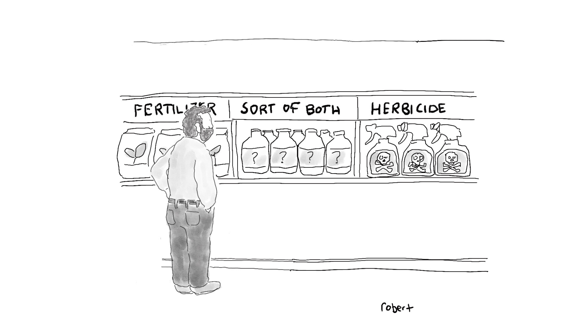 Labels help distinguish fertilizer from herbicide on the shelf at the garden supplies store.